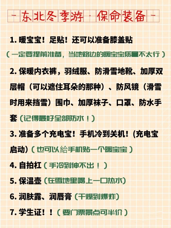 7,手机相机等电子设备注意保暖,低温容易造成关机,建议买点暖贴。